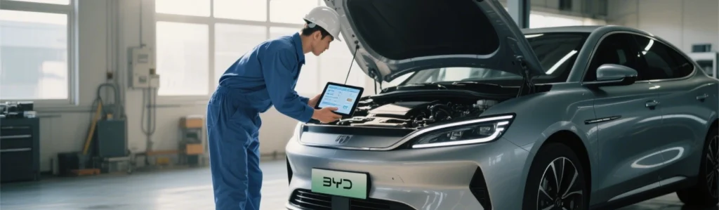 Close-up of a mechanic holding a rugged handheld diagnostic computer over a car engine to view technical schematics and sensor data.
